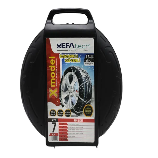 Безбедно возење во зимски услови со MefaTech X-Model синџирите за гуми. Изработени од зајакнат челичен кабел со дебелина од 12 mm, овие синџири нудат одлична издржливост, сигурно држење и лесна монтажа.